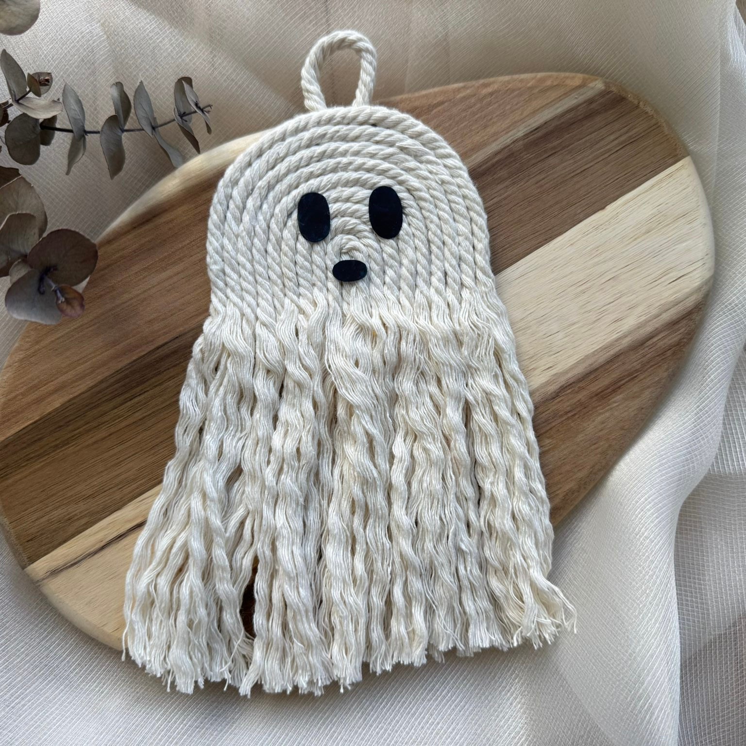 Fantasma decorativo hecho a mano con cuerda blanca de macramé. Un diseño original, adorable y único que aporta un toque encantador y divertido a cualquier rincón de tu hogar.
