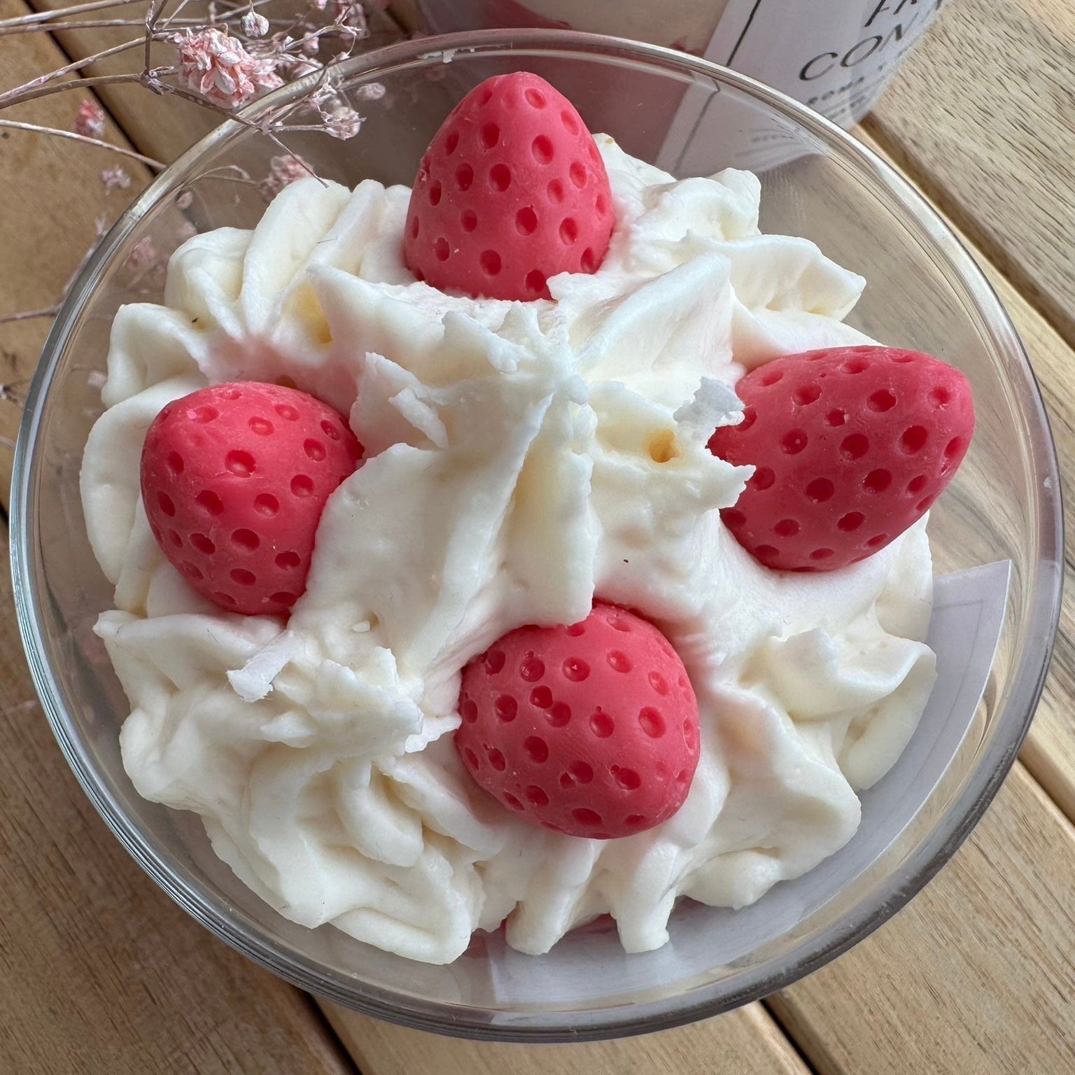 Vela aromática con esencia de fresas con nata, que ofrece un aroma dulce y cremoso, evocando la frescura y dulzura de este clásico postre. Decorada artesanalmente con un diseño tipo frosting y detalles que representan fresas y nata, aporta un toque delicado y apetitoso a cualquier ambiente.