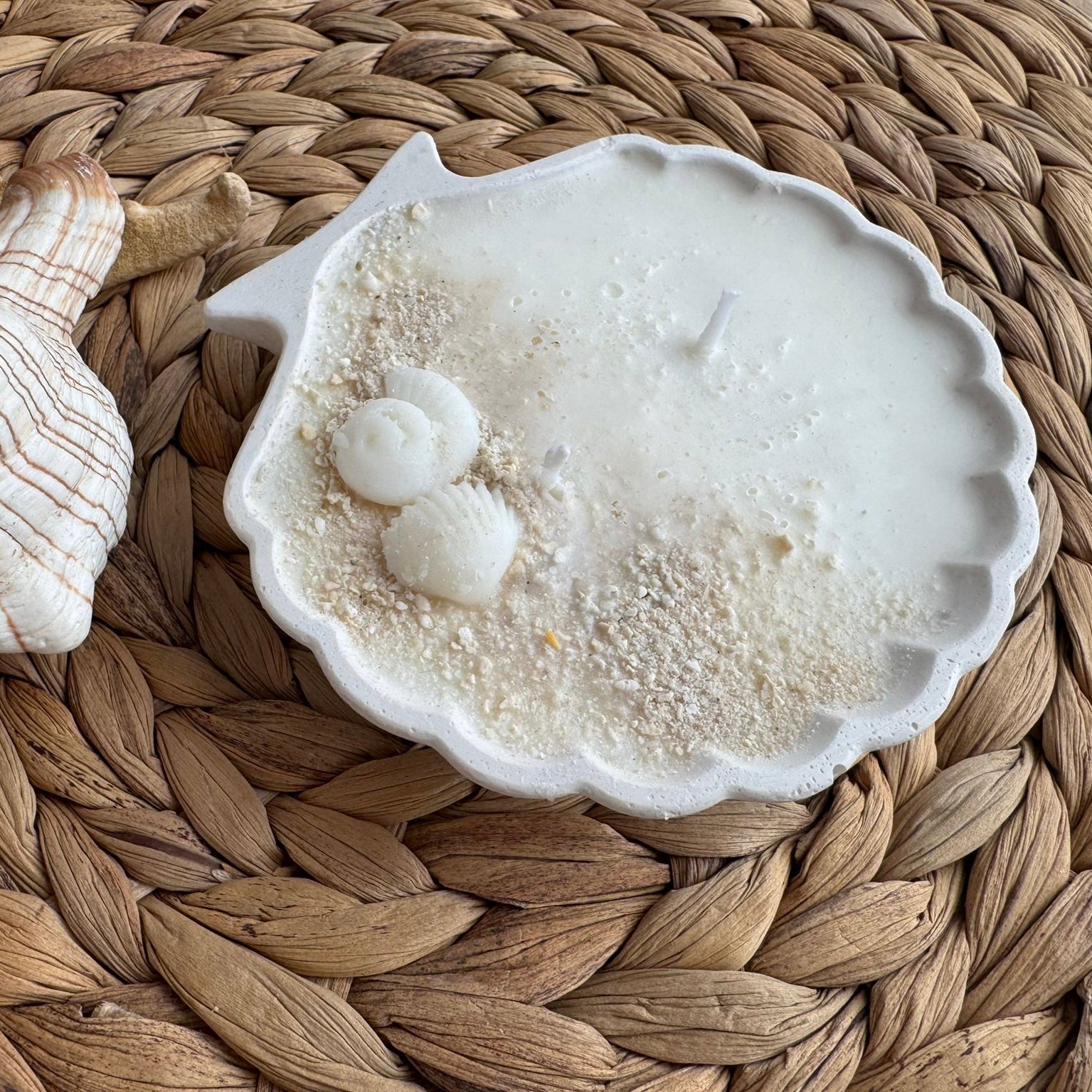 Vela aromática vertida en un recipiente artesanal con forma de concha hecho a mano con yeso. Su aroma fresco y salino evoca la tranquilidad del mar, ideal para crear ambientes relajantes y naturales.