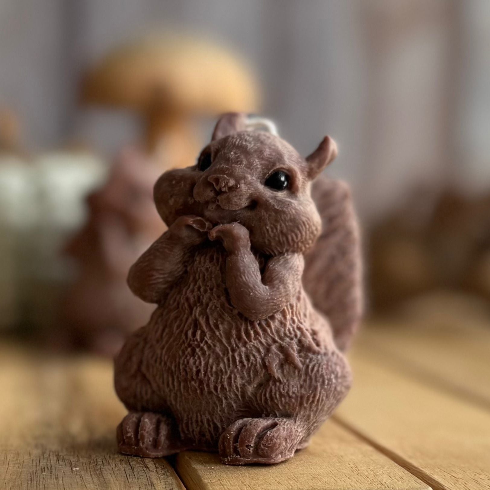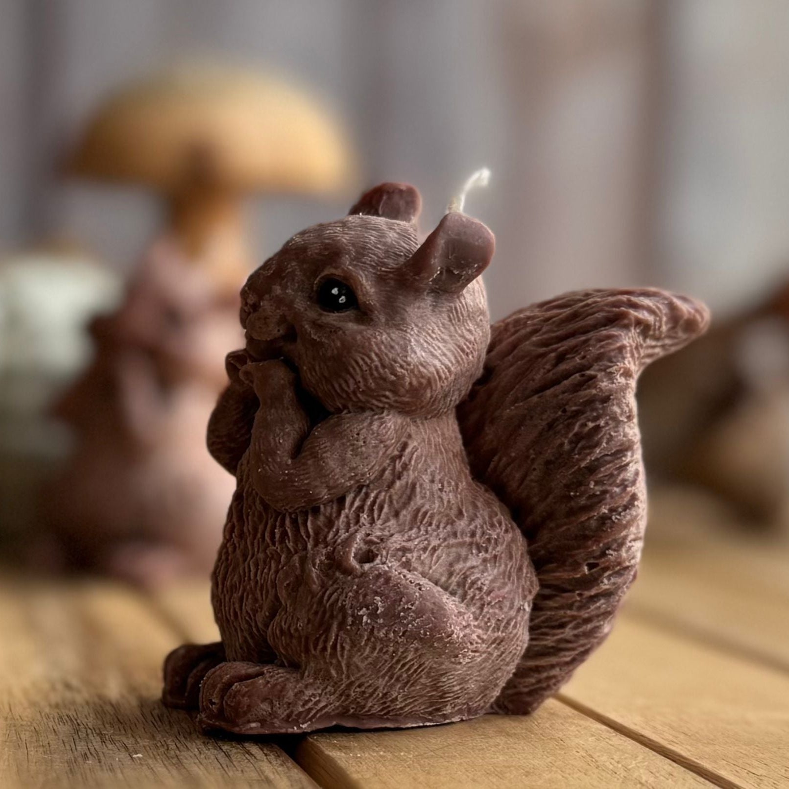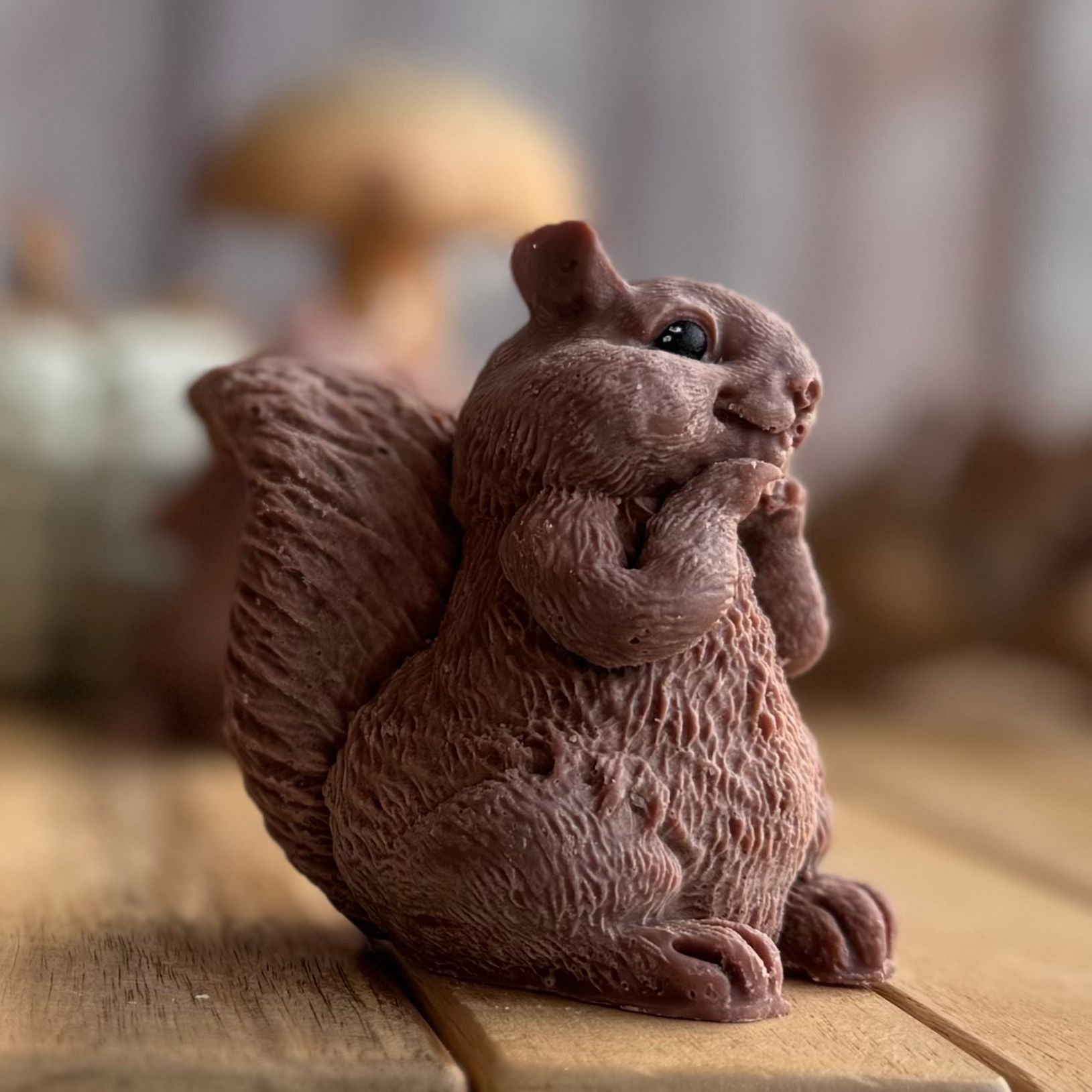 Vela artesanal con forma de ardilla, ideal para decoraciones otoñales o navideñas. Su diseño detallado y encantador aporta calidez y un toque natural a cualquier espacio.