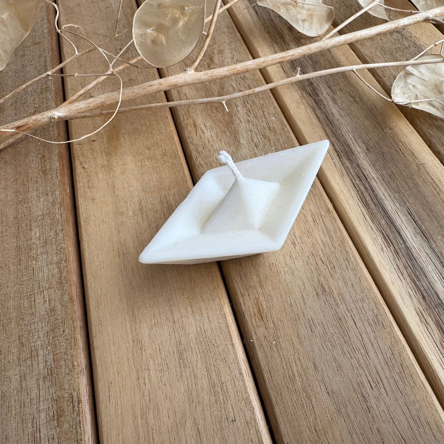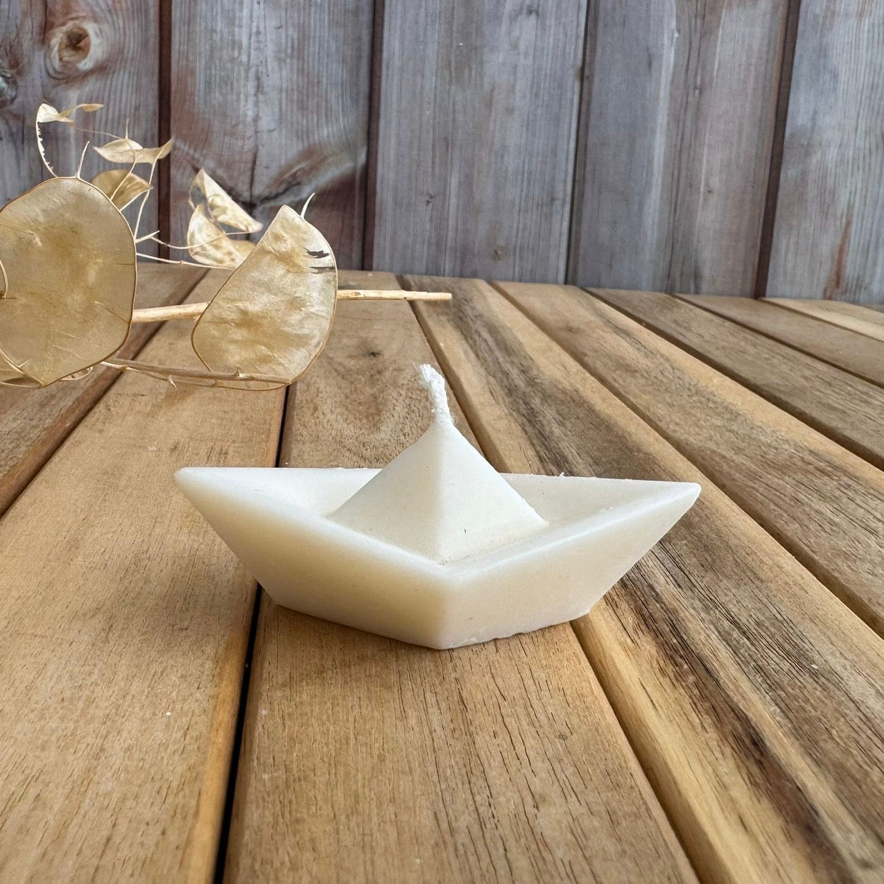Vela artesanal con forma de barquito de papel, perfecta para decorar con un aire nostálgico y delicado cualquier rincón.