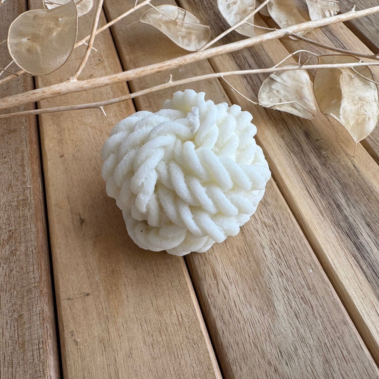 Vela artesanal con forma de bola envuelta en un delicado diseño de cuerda, ideal para aportar un toque rústico y elegante a cualquier espacio.