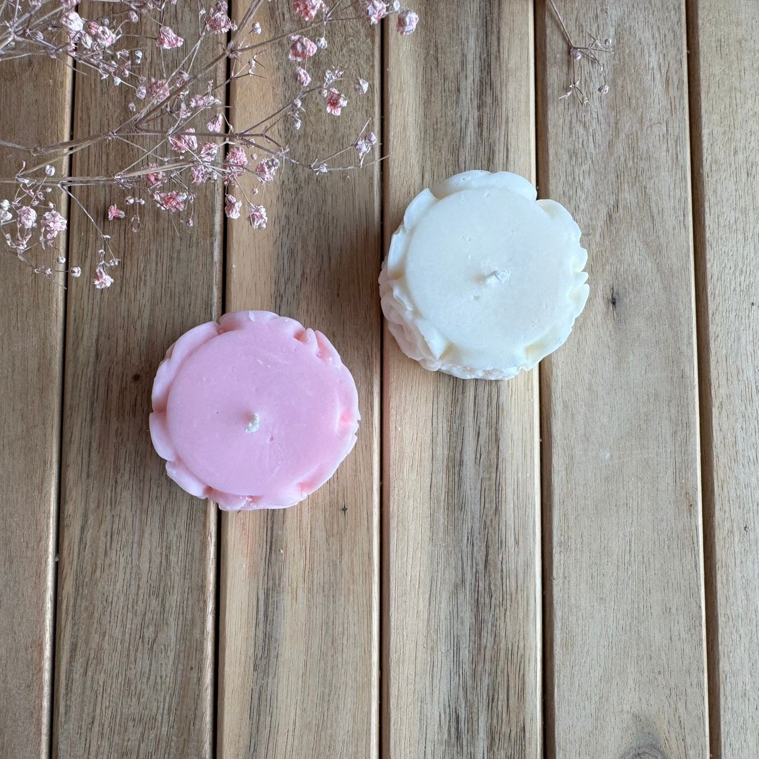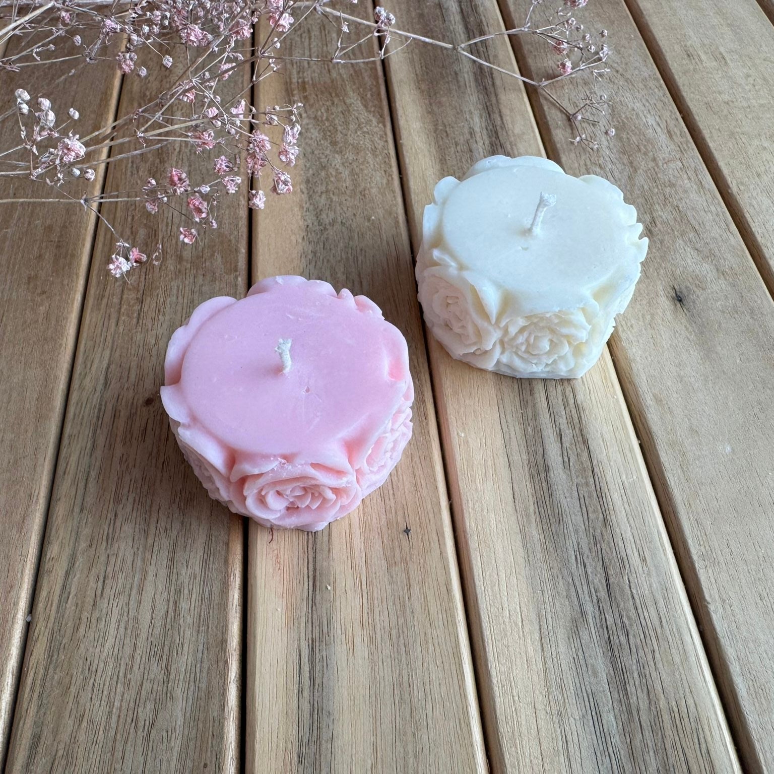 Vela artesanal con forma cilíndrica pequeña y decoración floral, ideal para acompañar otras velas o detalles decorativos.
