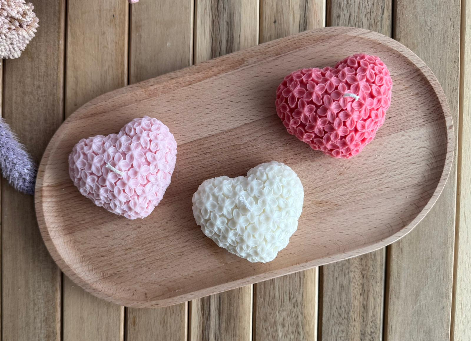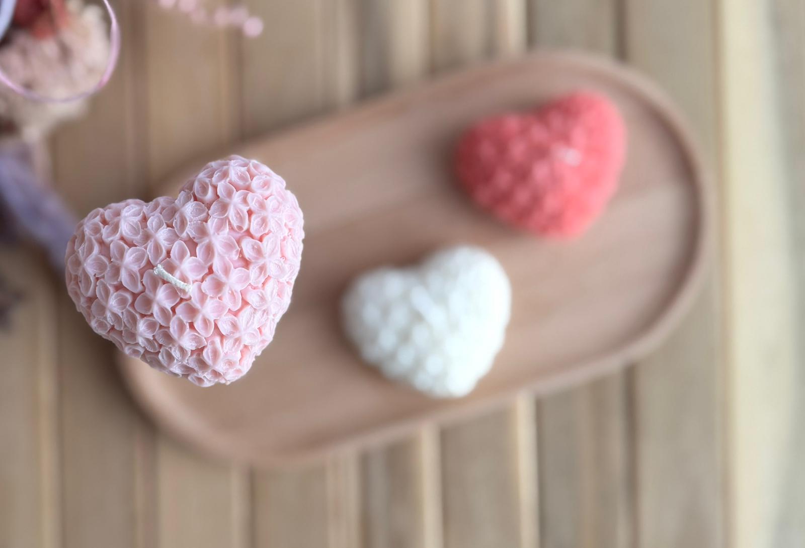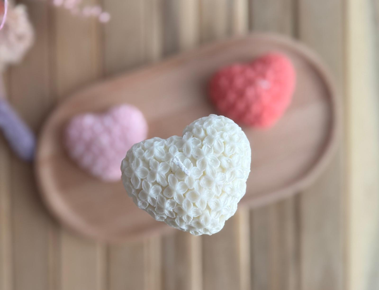 Vela artesanal con forma de corazón decorado con flores en relieve. Romántica y delicada, ideal para regalar o ambientar espacios acogedores.
