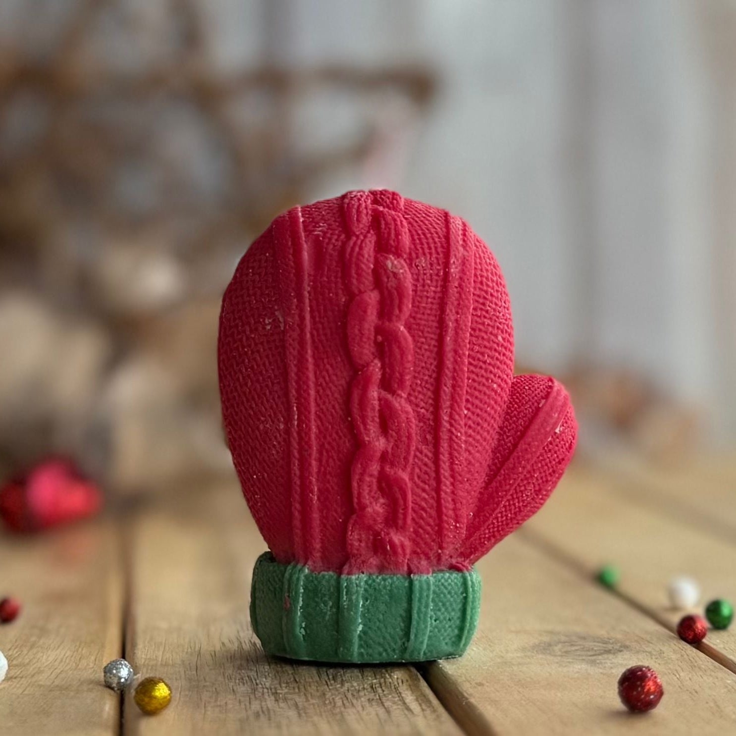 Vela artesanal con forma de guante, ideal para decoraciones navideñas o de invierno. Su diseño suave y detallado aporta un toque cálido y acogedor a cualquier ambiente festivo.