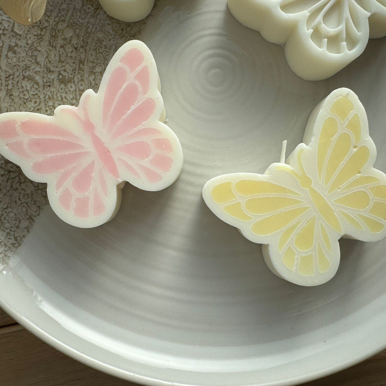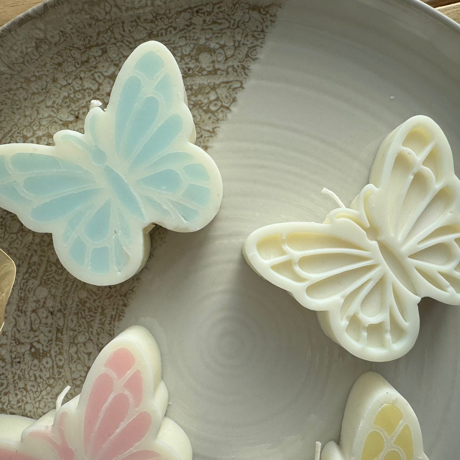 Vela artesanal con forma de mariposa, ideal para dar un toque delicado y natural a cualquier ambiente.