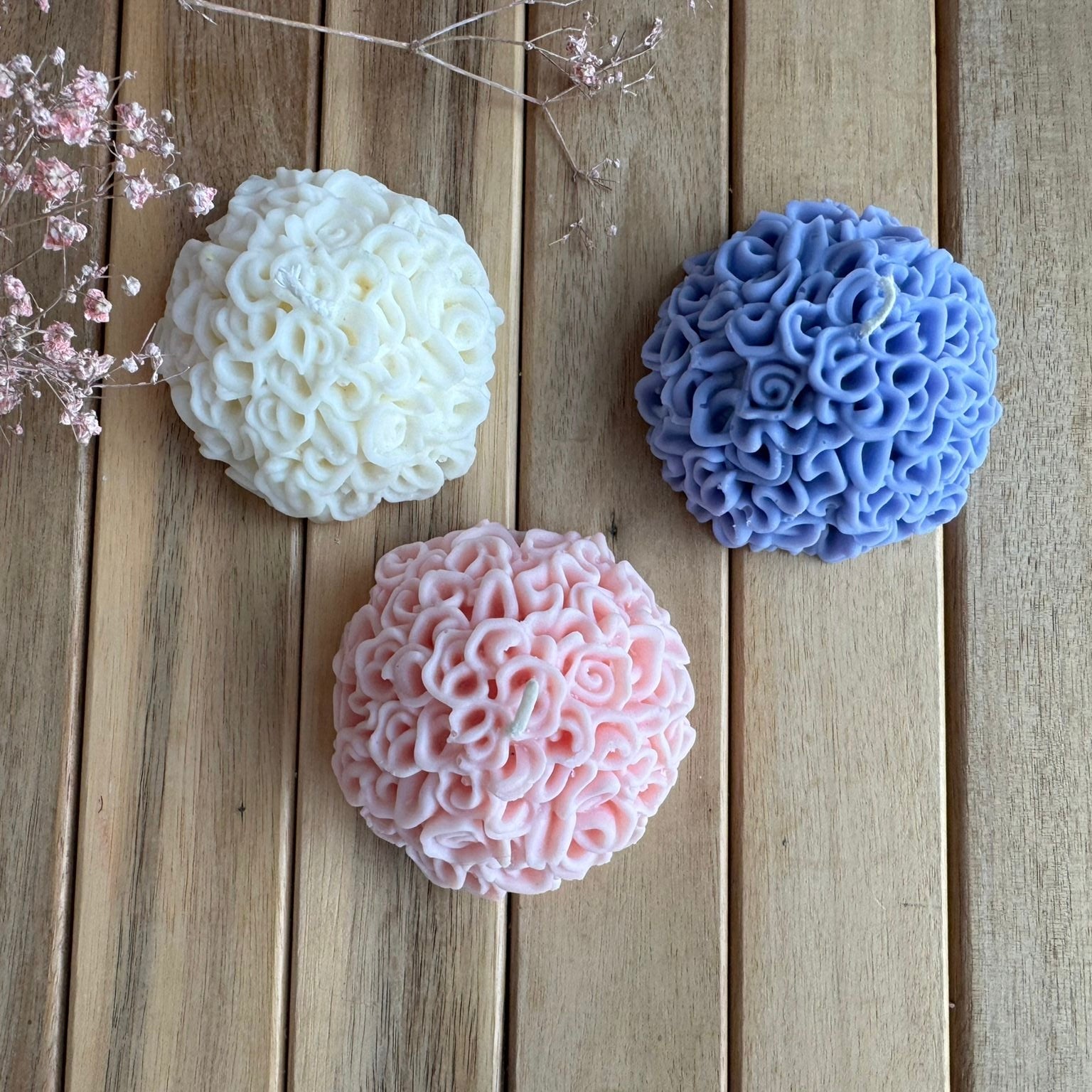 Vela artesanal con forma de media esfera decorada con flores, perfecta como pieza decorativa para estanterías o mesas auxiliares.