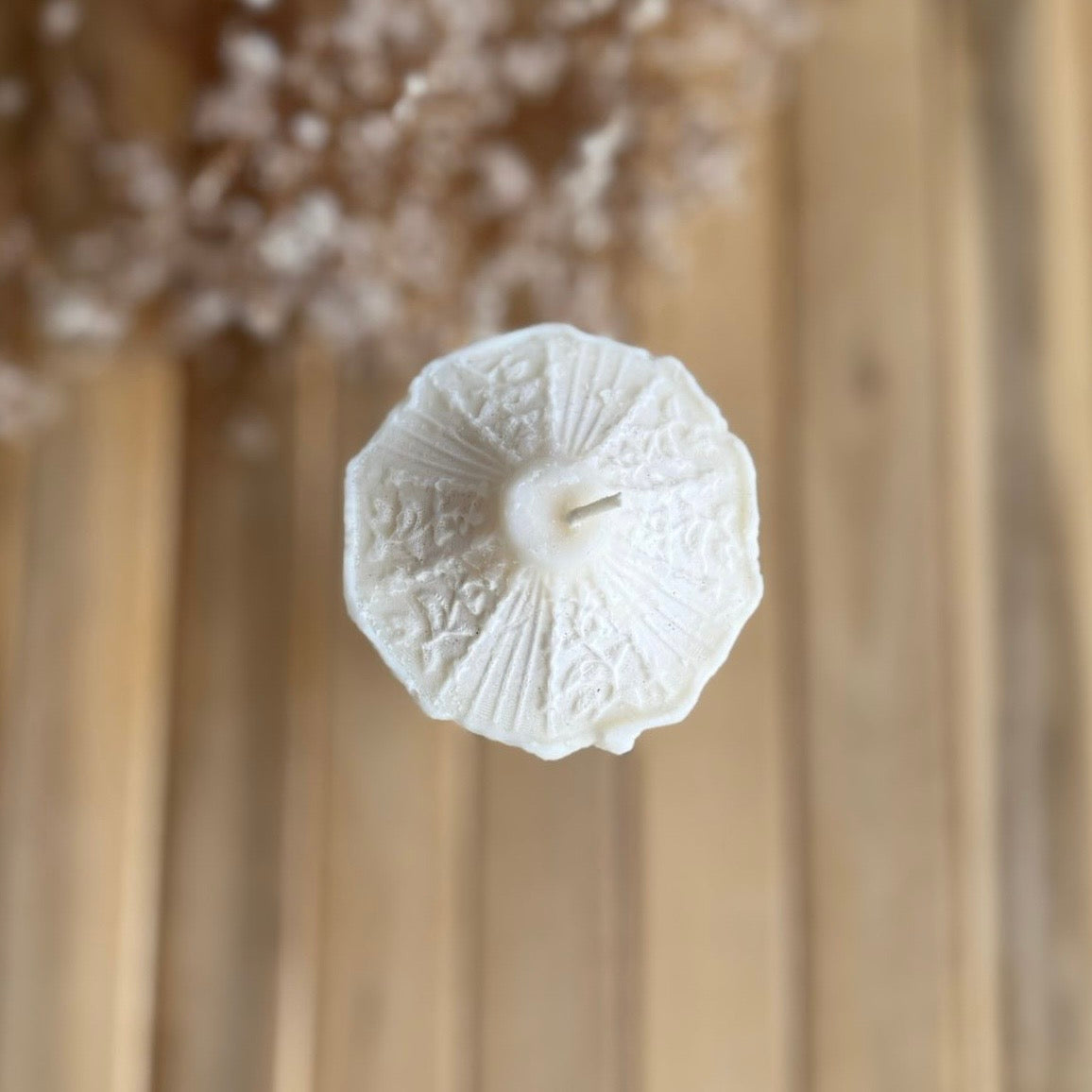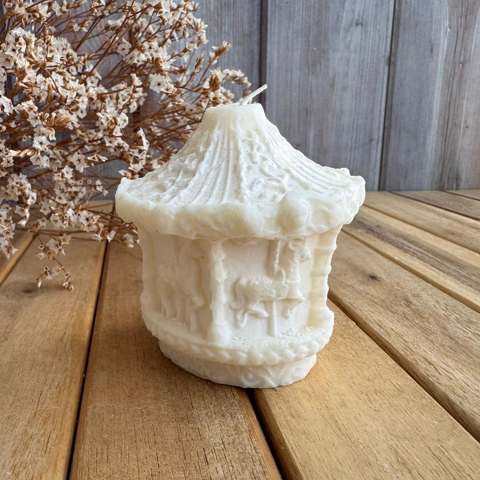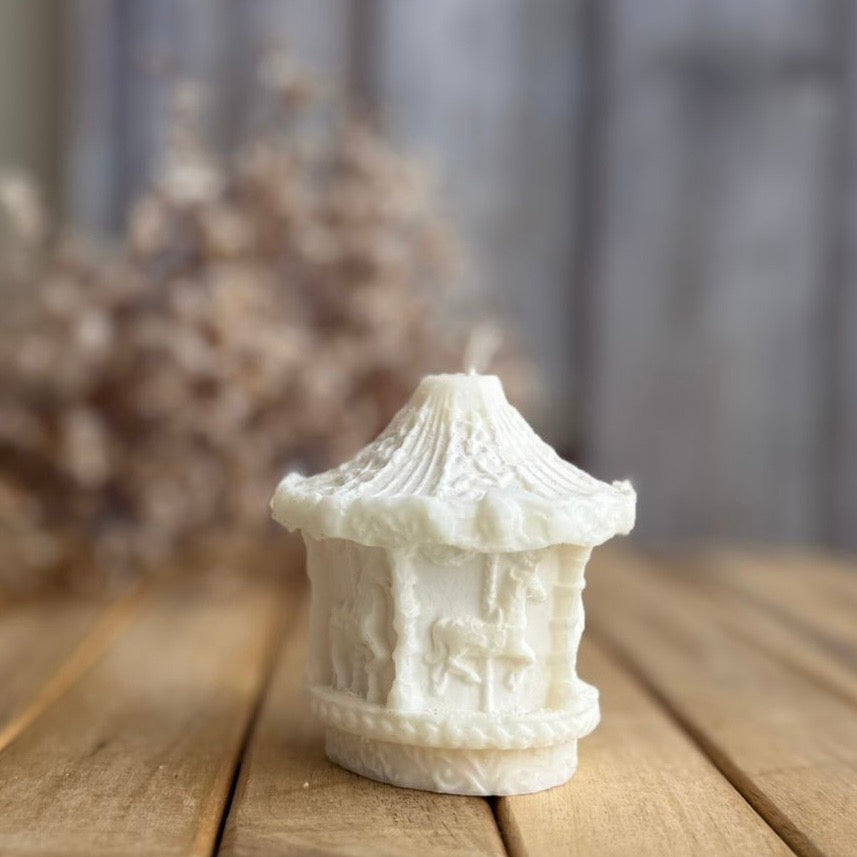 Vela artesanal con forma de noria, evocando la magia y diversión de la feria, perfecta para decorar con un toque alegre y nostálgico.