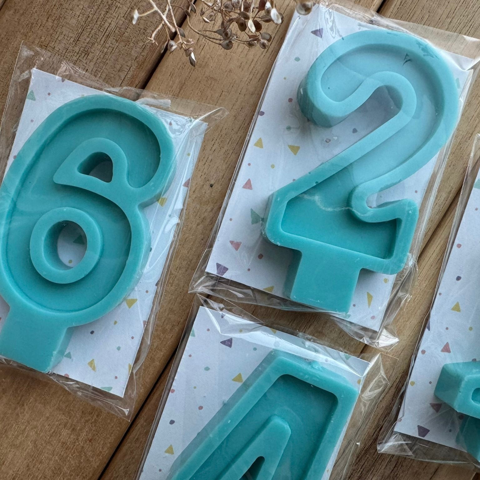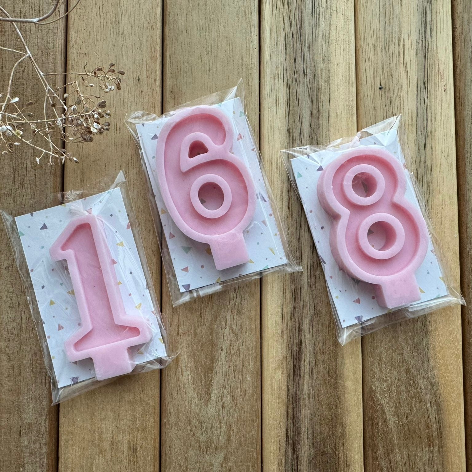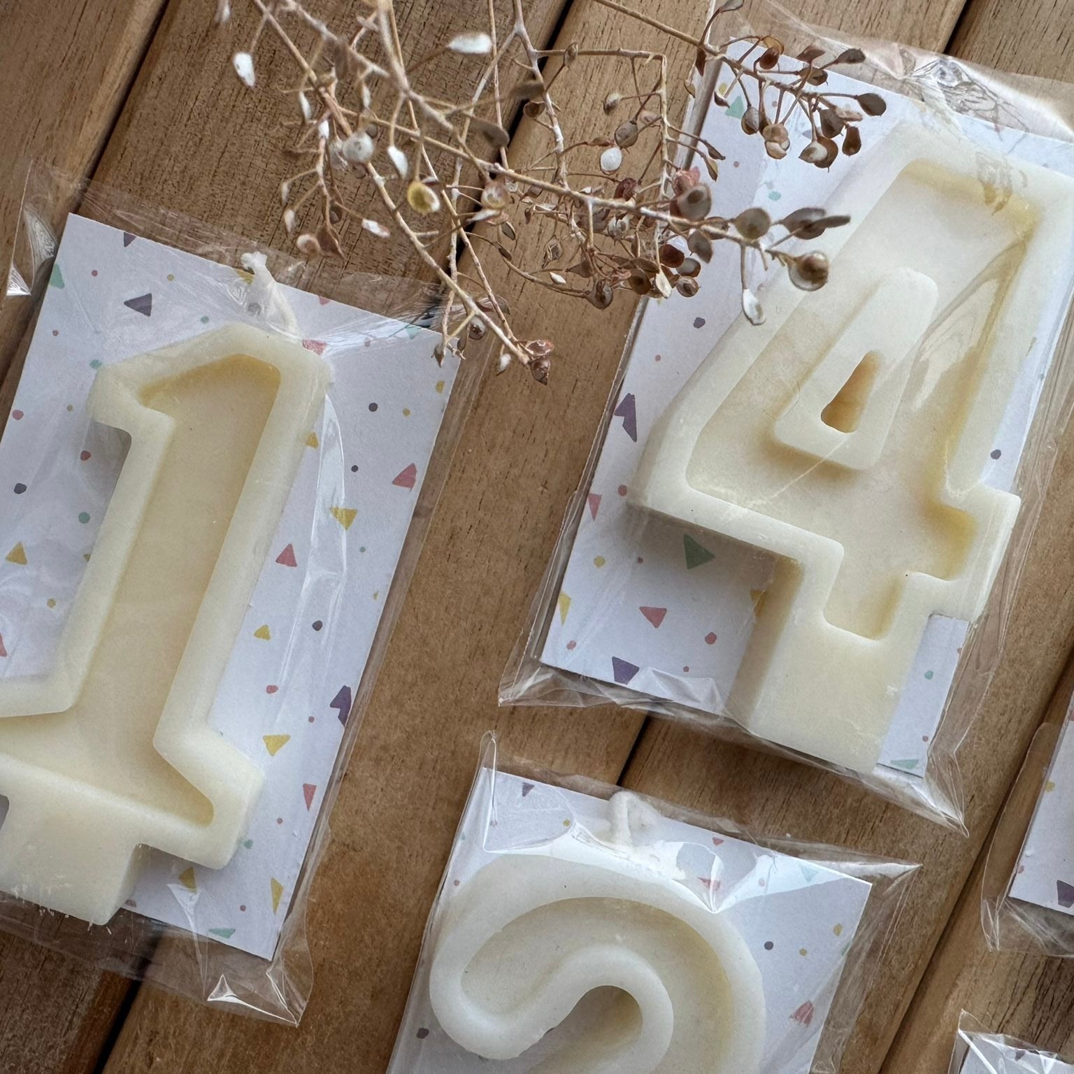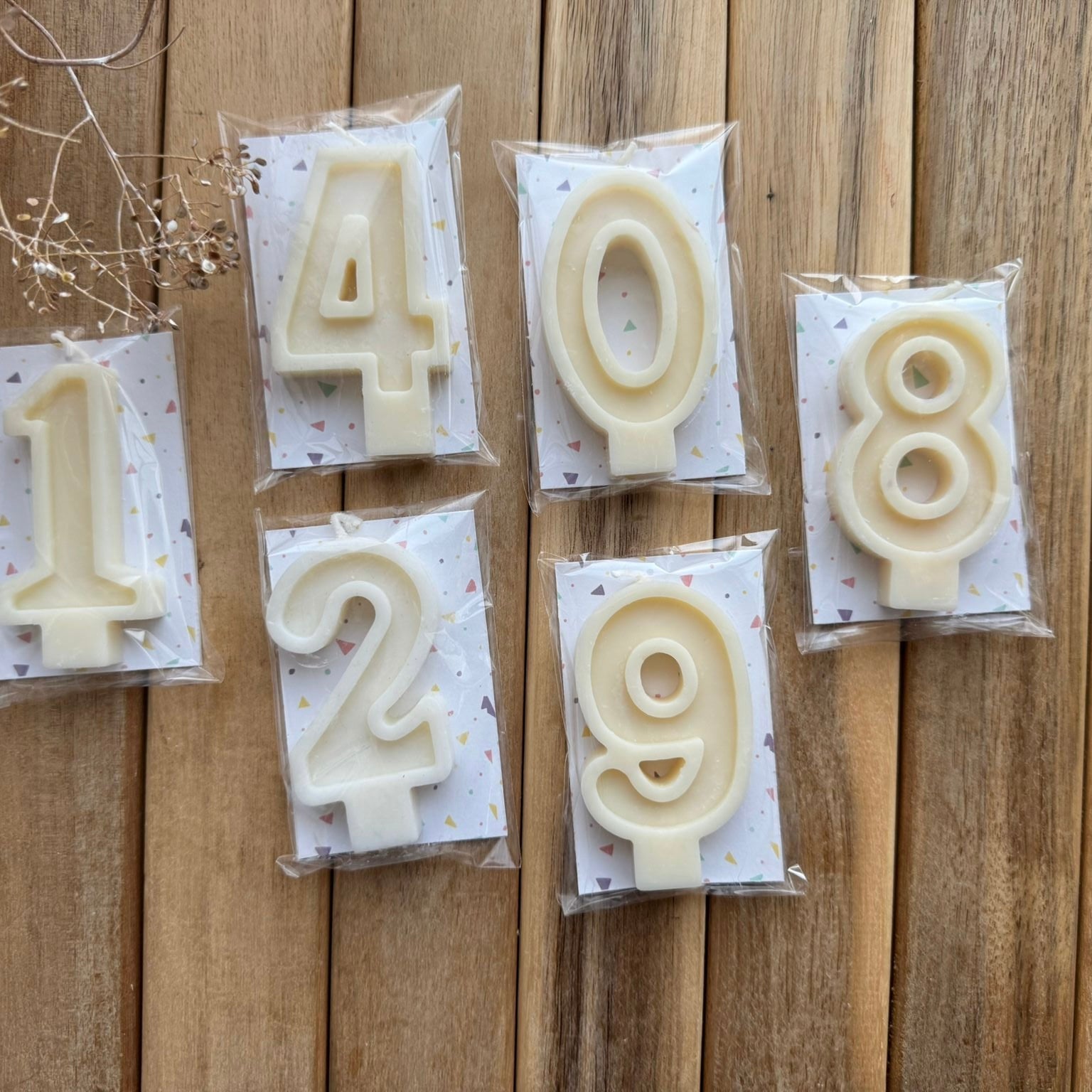 Velas de cumpleaños elaboradas a mano con cera de soja 100% vegetal. Diseñadas para dar un toque especial a tus celebraciones, aportando un acabado elegante y natural a tus tartas y postres.